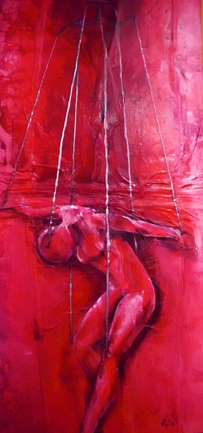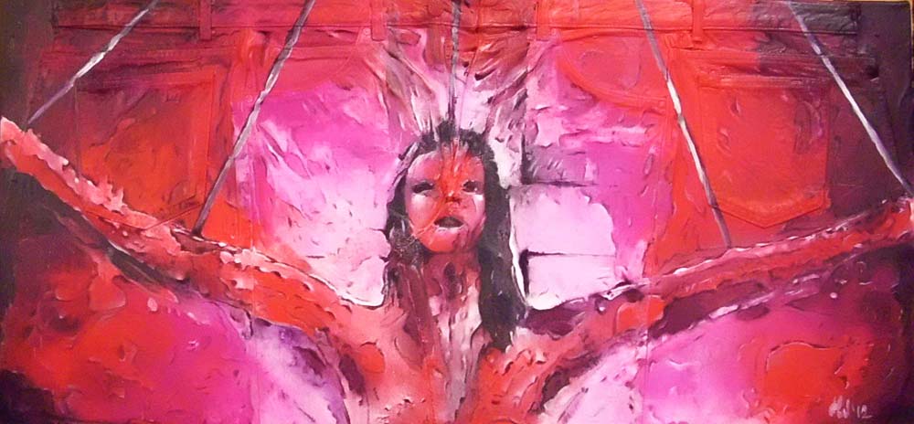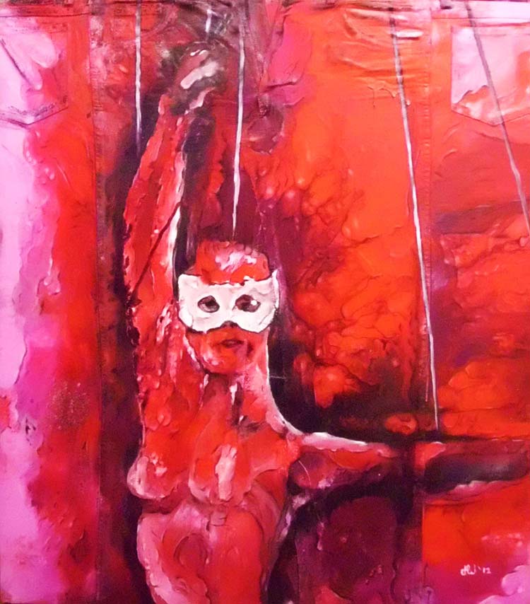 Als Malgrund meiner Acrylbilder verwende ich ausschließlich an den Nähten aufgetrennten Jeans. So erschaffe ich eine immer wiederkehrende, einzigartige, augenzwinkernde Hommage an die Allerweltshose und das Bild offenbart eine Corporate Identity, bevor noch ein einziges Farbpigment auf meinen Stil hinweist.