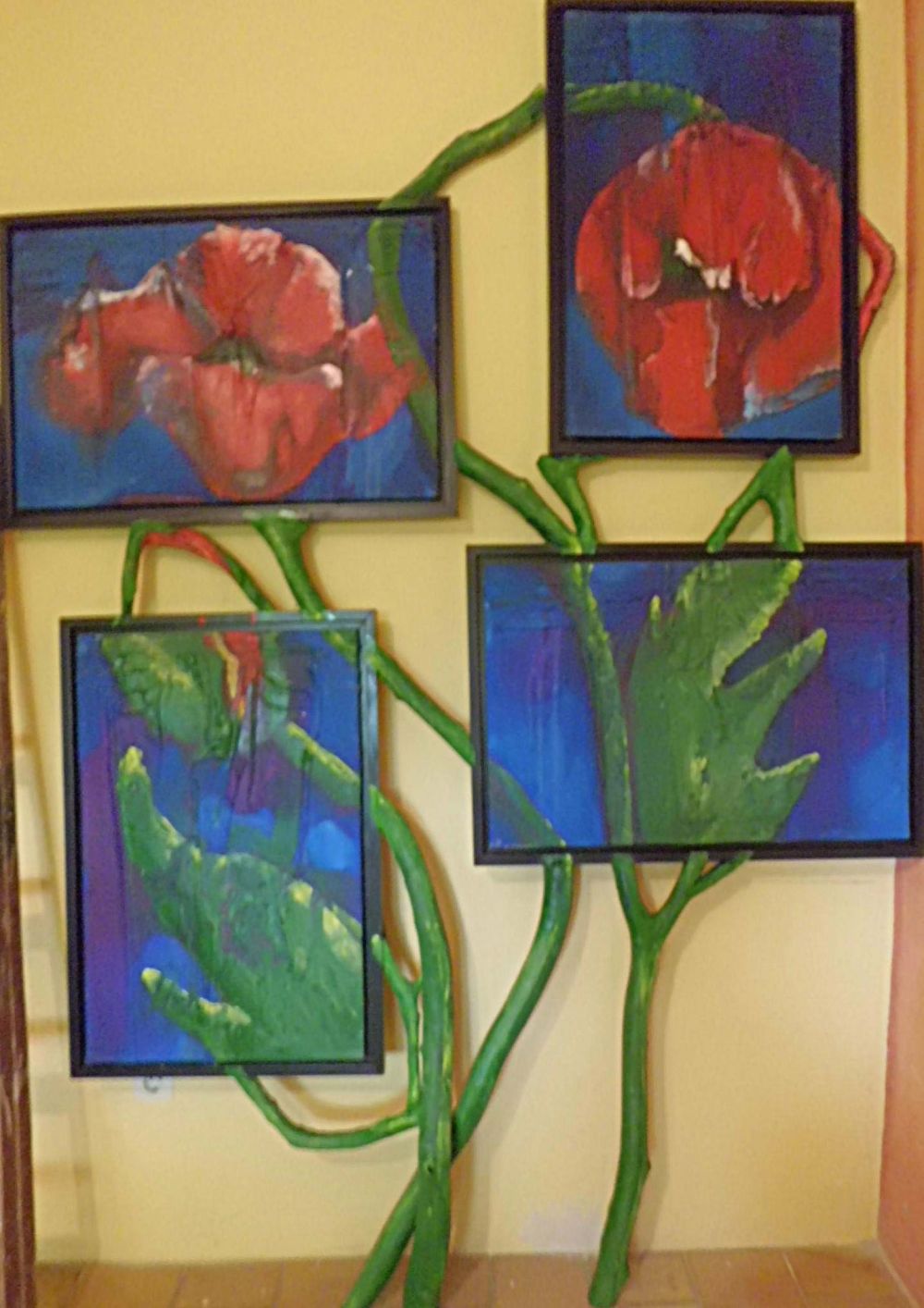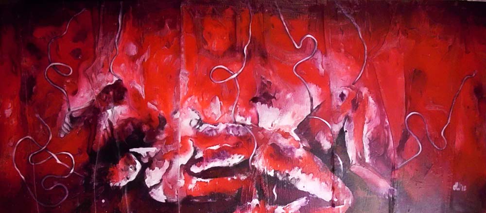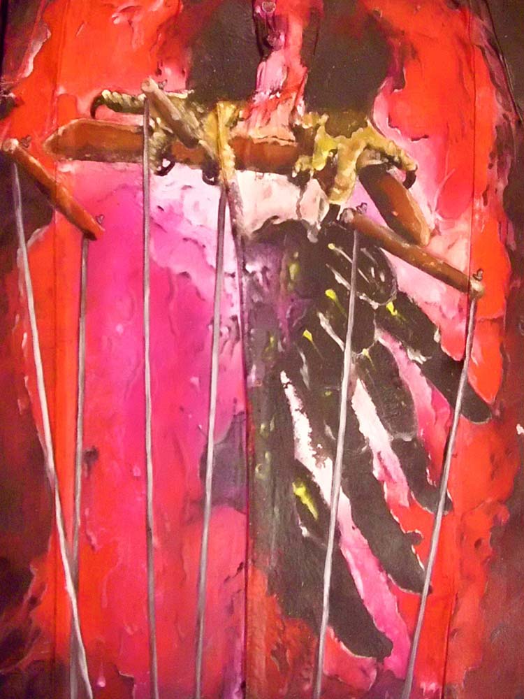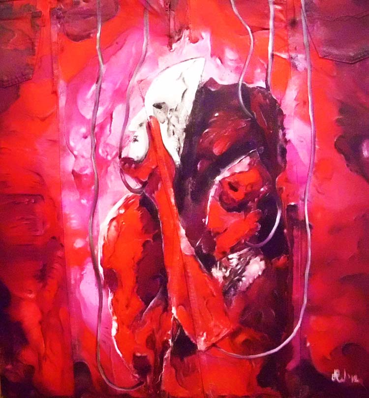 Nähte, Taschen und Knöpfe erzeugen eine bereits vorgegebene Struktur, auf welcher der ich mit Acrylfarben arbeite. In einer speziellen Gießtechnik entstehen meine Bilder.