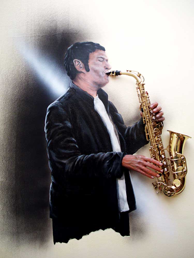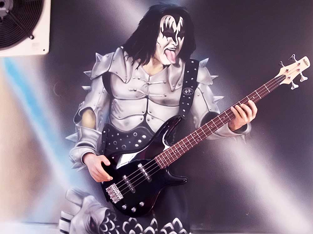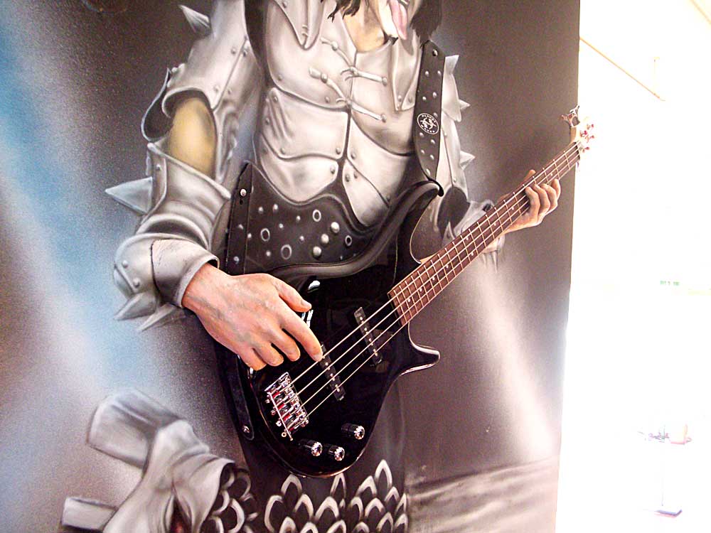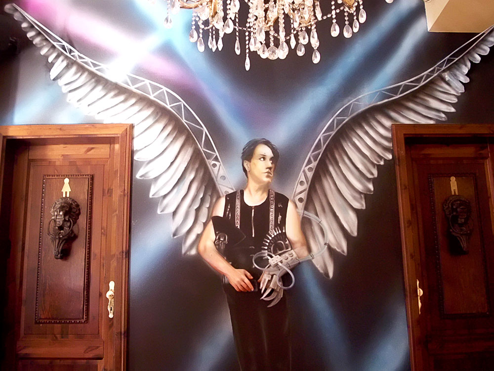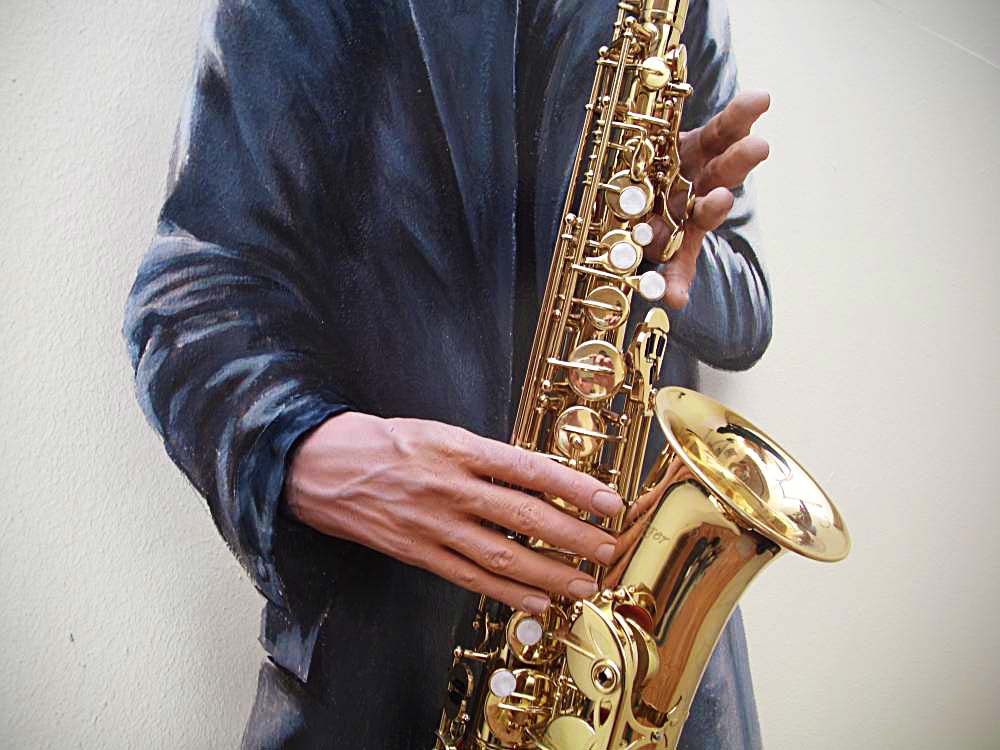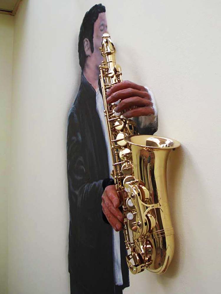 Das Hintergrundbild ist gemalt, Hände und Instrument sind real und verlassen das Bild.