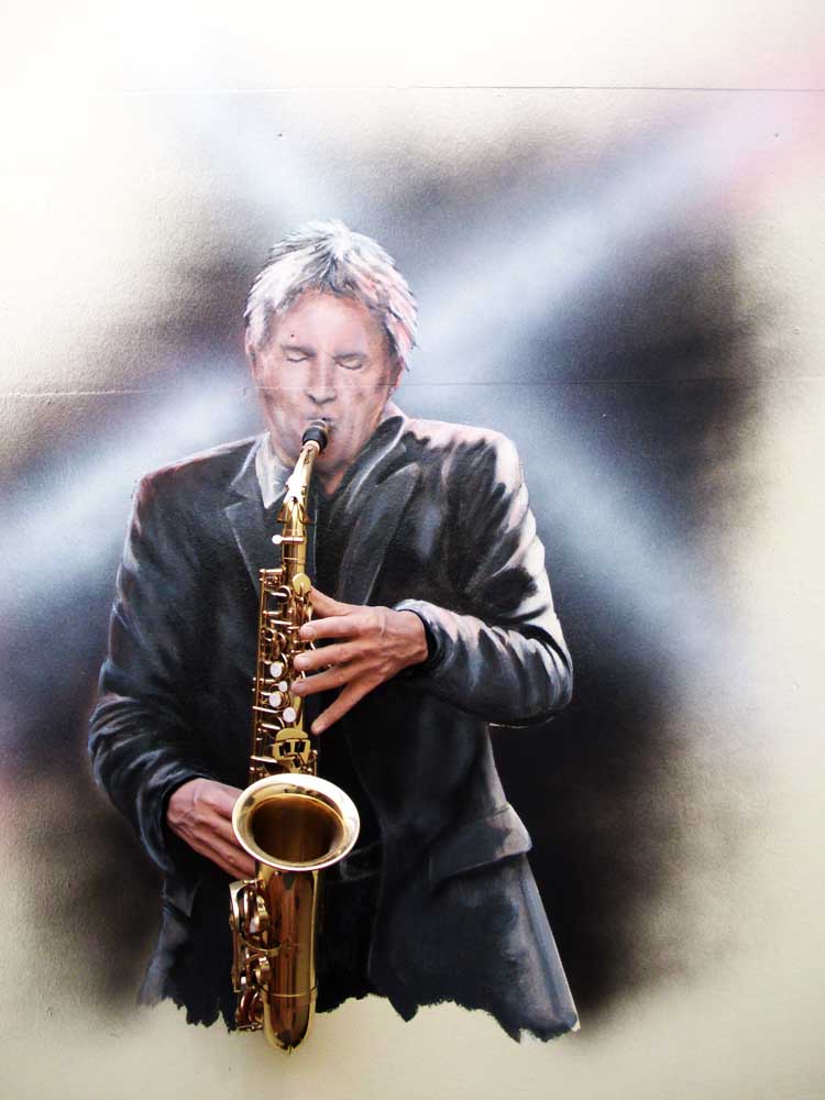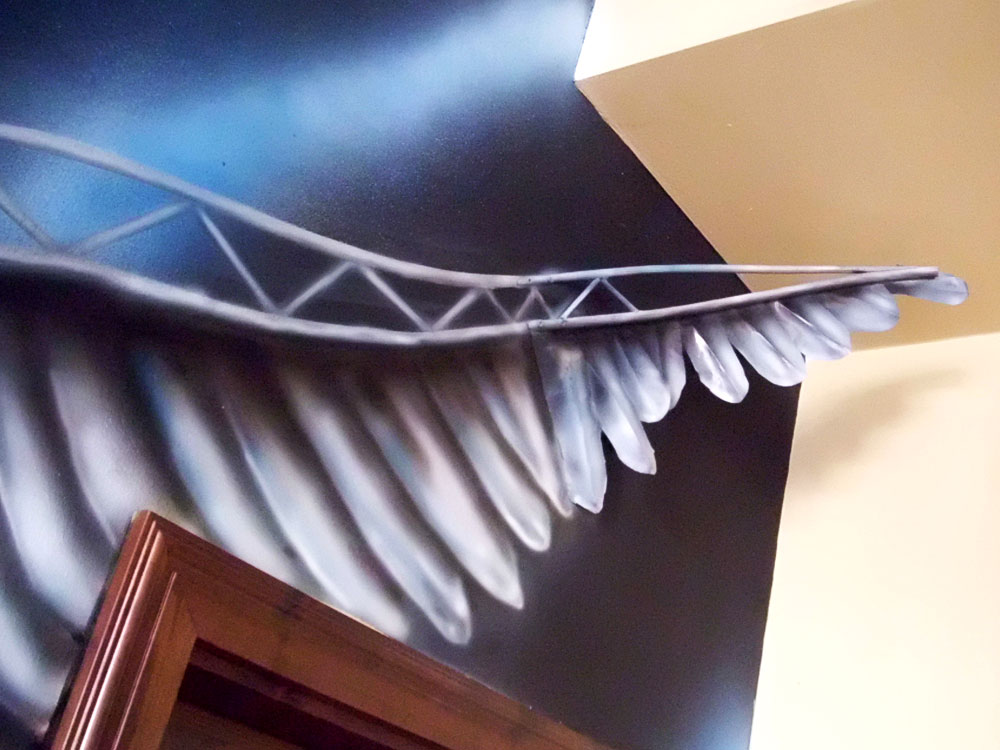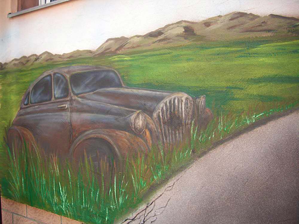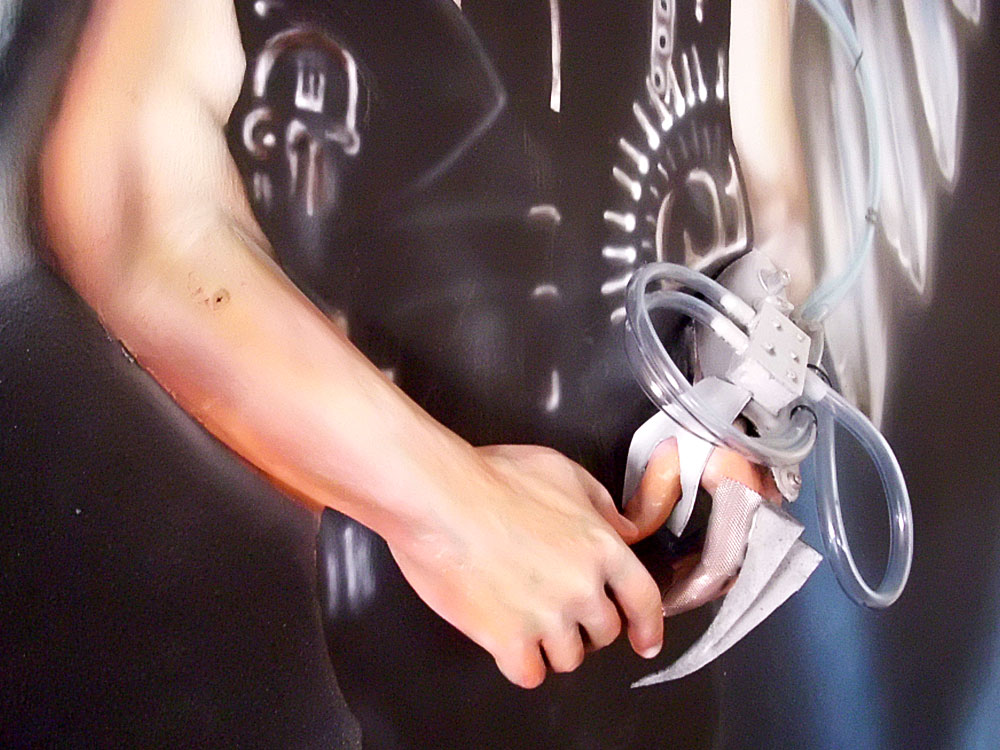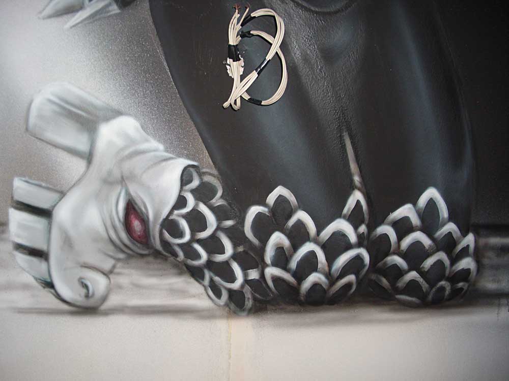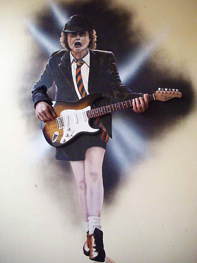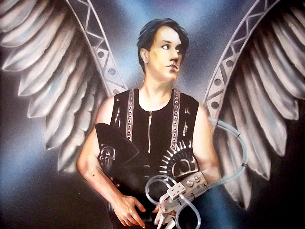 Das Hintergrundbild ist gemalt, Hände und Instrument sind real und verlassen das Bild.