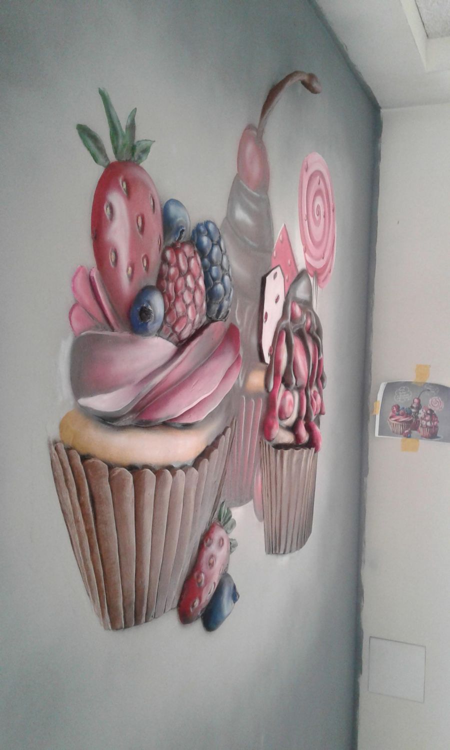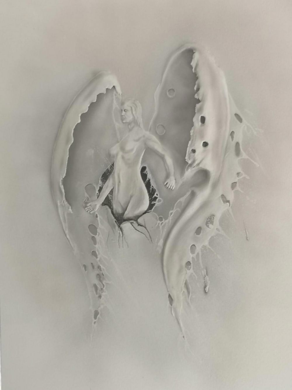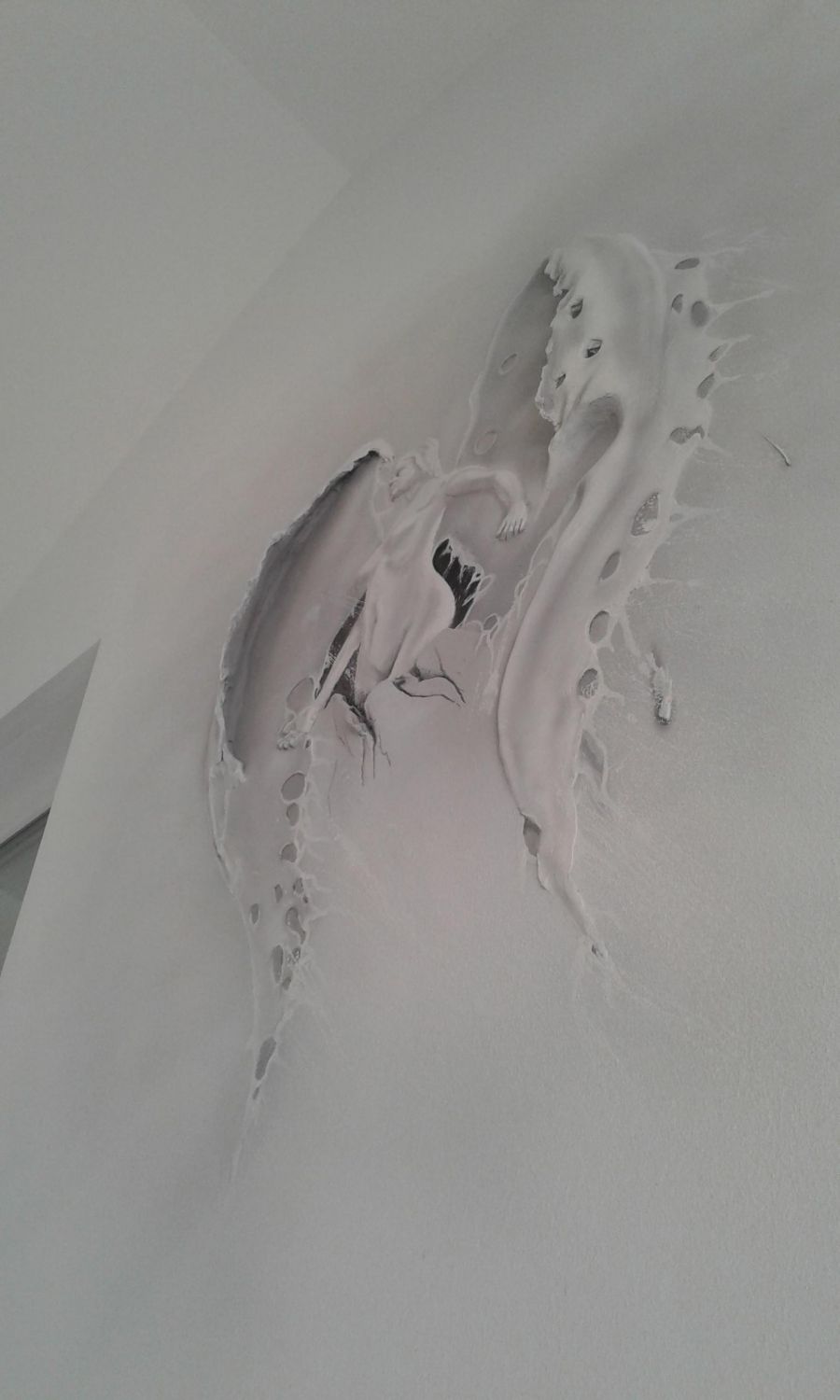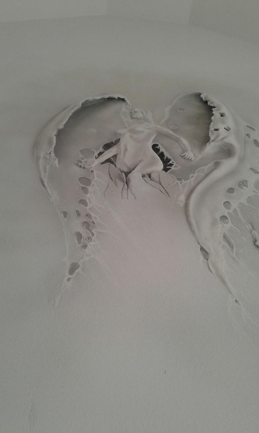 Das Hintergrundbild ist gemalt, Hände und Instrument sind real und verlassen das Bild.