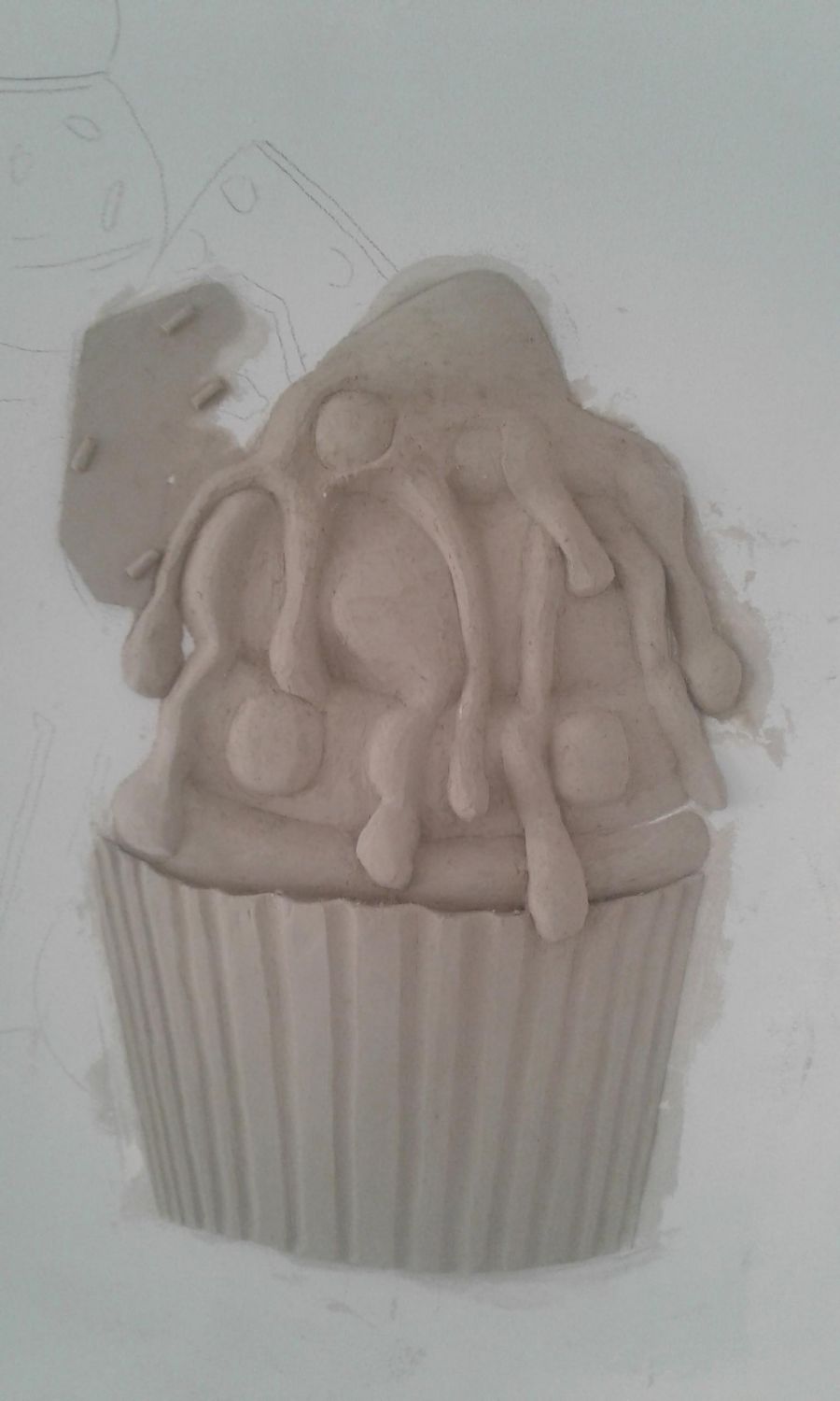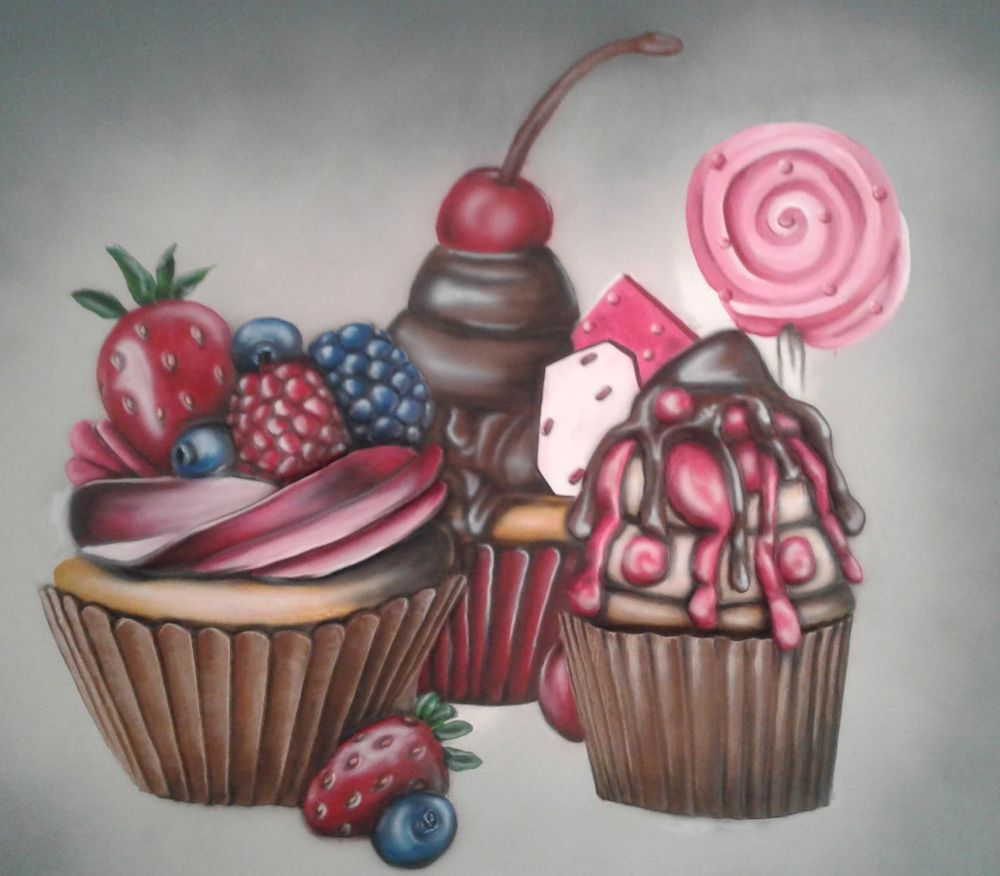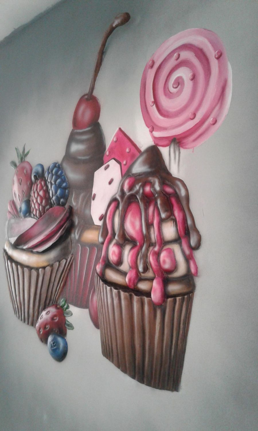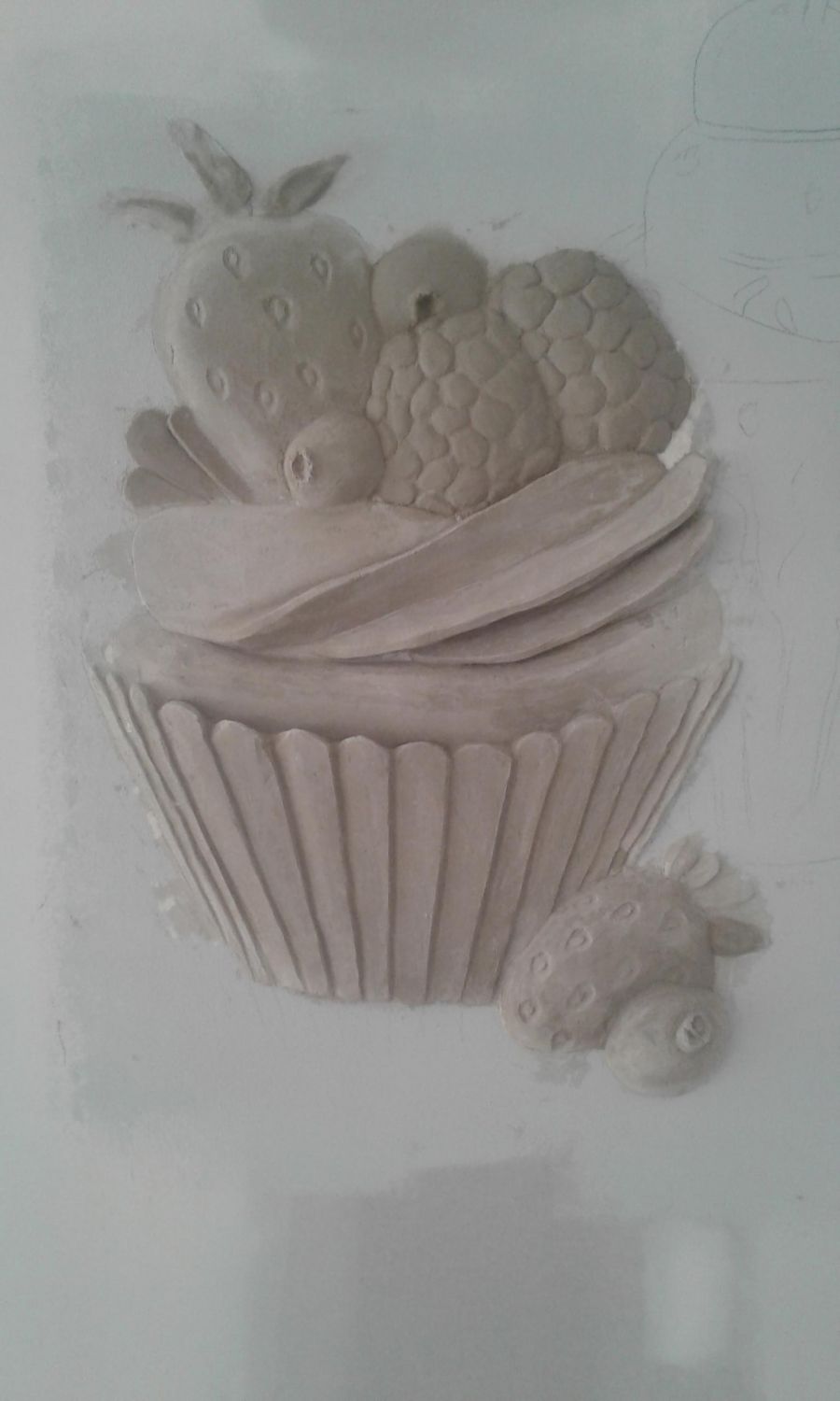 Das Hintergrundbild ist gemalt, Hände und Instrument sind real und verlassen das Bild.